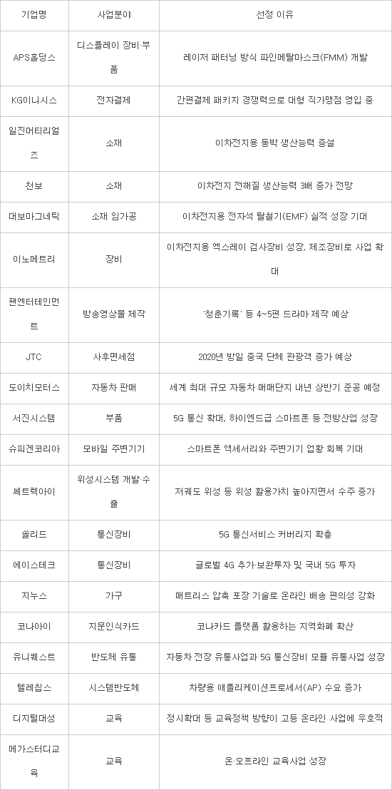 그 외 KG이니시스, 팬엔터테인먼트, JTC, 서진시스템, 슈피겐코리아, 쎄트렉아이, 에이스테크, 텔레칩스, 디지털대성, 메가스터디교육 등이 꼽혔다.