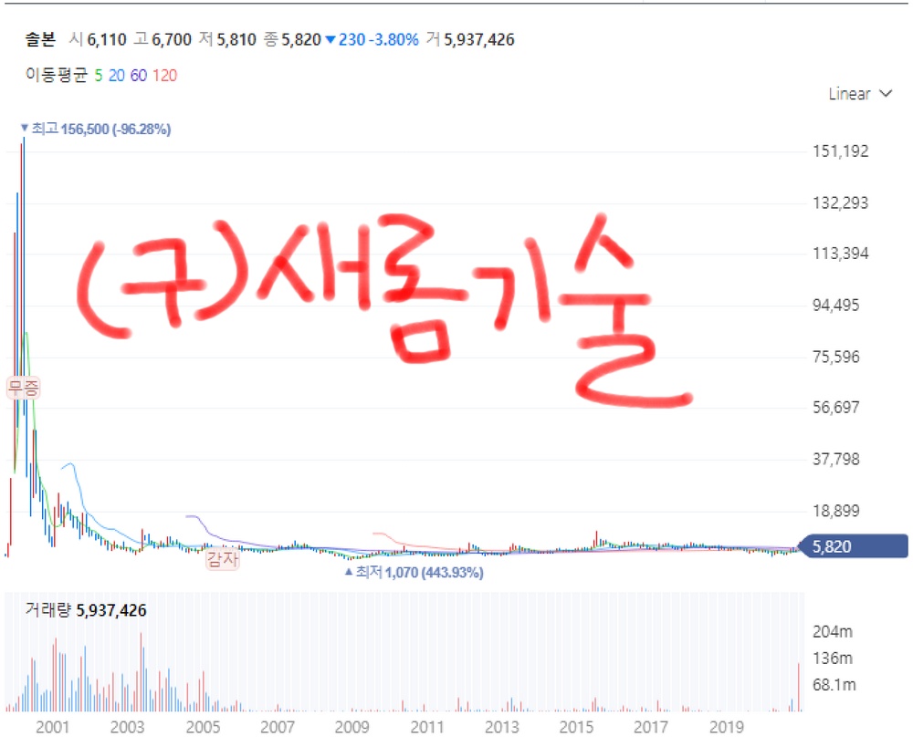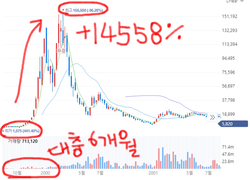 당시 새롬기술 주가가 1999년 1000원대에서 출발해서 반년만에 무려 156500원까지 상승했다. 실제 당시 주가는 저건 아닌데 무증이 반영되서 지금 조회하면 저렇게 보인다. +14558% 상승률. 약 150배 올랐다. 당시 새롬기술은 네이버와 다음을 합병하려고도 했었다. ㅋㅋㅋㅋ